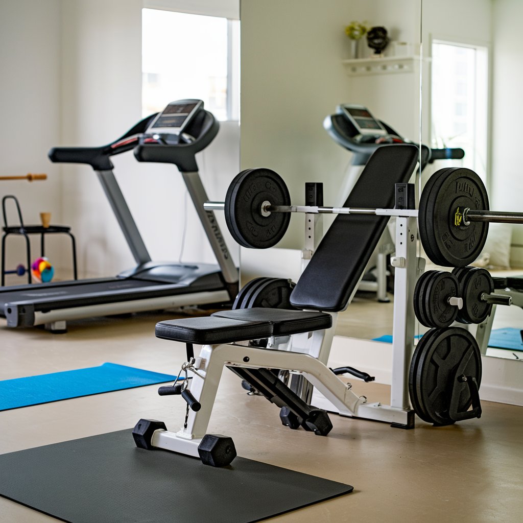 No home gym is complete without a barbell, weight plates, and flat bench. This powerlifting trio forms the backbone of any serious strength training program and allows you to perform compound exercises that target full body movements.